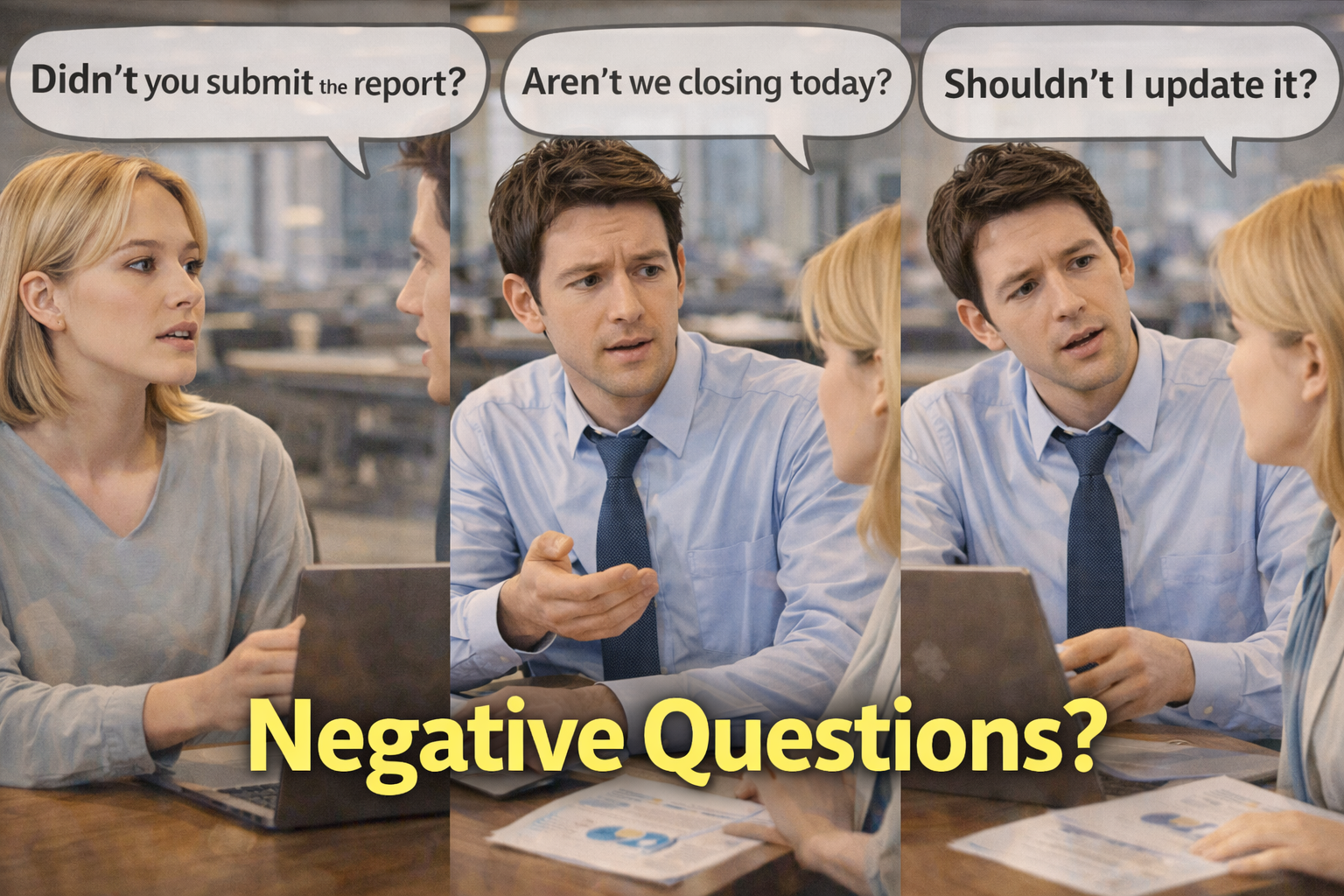 Negative questions are one of the most confusing parts of English communication for learners. In workplace conversations and TOEIC listening sections, speakers often use them to confirm expectations or express surprise. Understanding how to respond correctly is essential because the answer depends on reality, not the negative wording. Mastering this pattern significantly improves comprehension and communication accuracy.